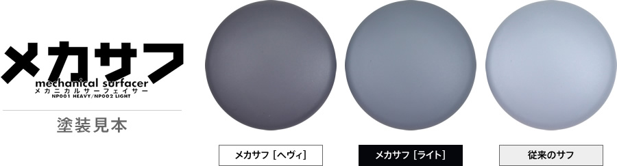 *Mecha Surfacer = Mechanical Surfacer is a reproduction of the surfacer that NAOKI regularly mixes and uses when creating prototypes and models, and comes in two colors. It is formulated to be a darker color than regular surfacer, so it can be used not only for creating a base, which is the main purpose of surfacer, but also as a direct color for internal mechanisms, frames, and weapons.